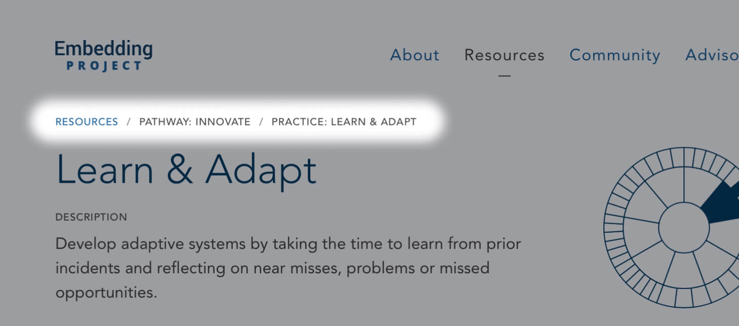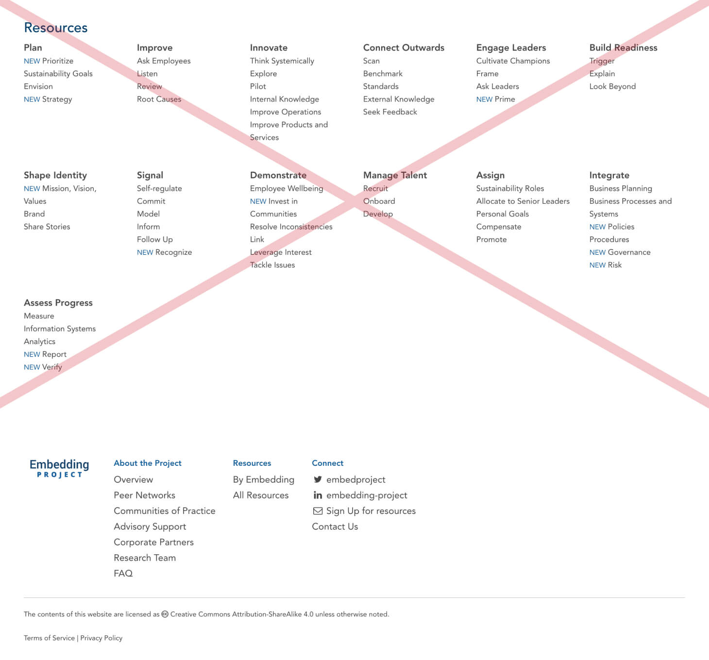 The Embedding Wheel is a key navigational point for the website. It represents how pathways, practices and resources are organised in the project database. Moreover, the entire Embedding Project branding and design is based on the wheel concept. The original concept of using the wheel was developed by Dr. Stephanie Bertels and the project's original developer. Pieoneers updated the wheel with a modern technology stack that allowed the Embedding Project to function on mobile devices and provide a better UX on all platforms.