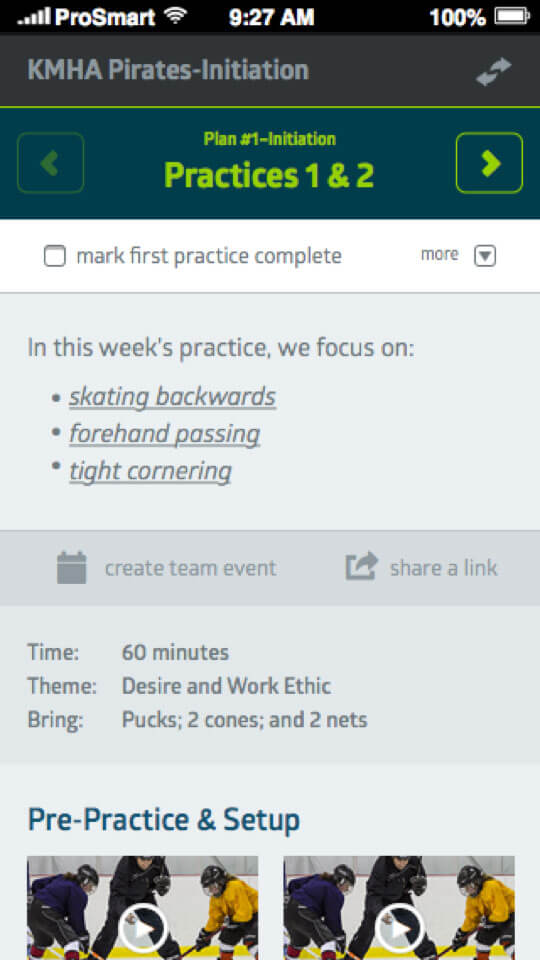 The ProSmart Sports iPhone app connects with the ProSmart Learning Platform and provides interactive coaching tools, progressive instructional videos featuring professional athletes, animated practice plans, team communication features, and more.